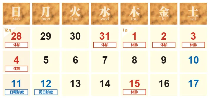 2025年12月31日(水)〜2026年1月4日(日)は誠に勝手ながら休診とさせていただきます。
